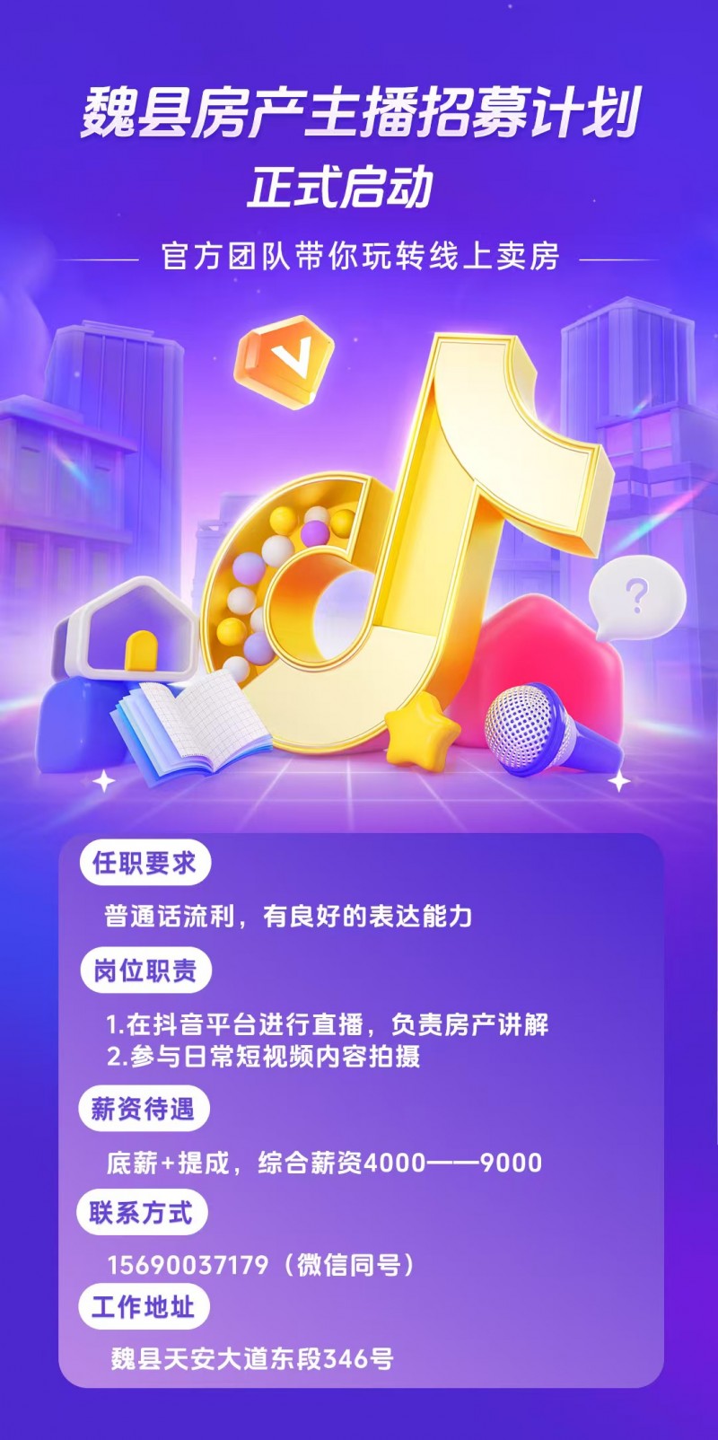诚聘【房产主播】 1. 岗位职责 . 负责直播讲解房产相关内容 . 配合拍摄房产相关短视频 2. 任职要求 五官端正,语言表达流利 3.薪资待遇 底薪+提成,综合薪资4000-9000 4. 工作地点 魏县天安大道东段346号